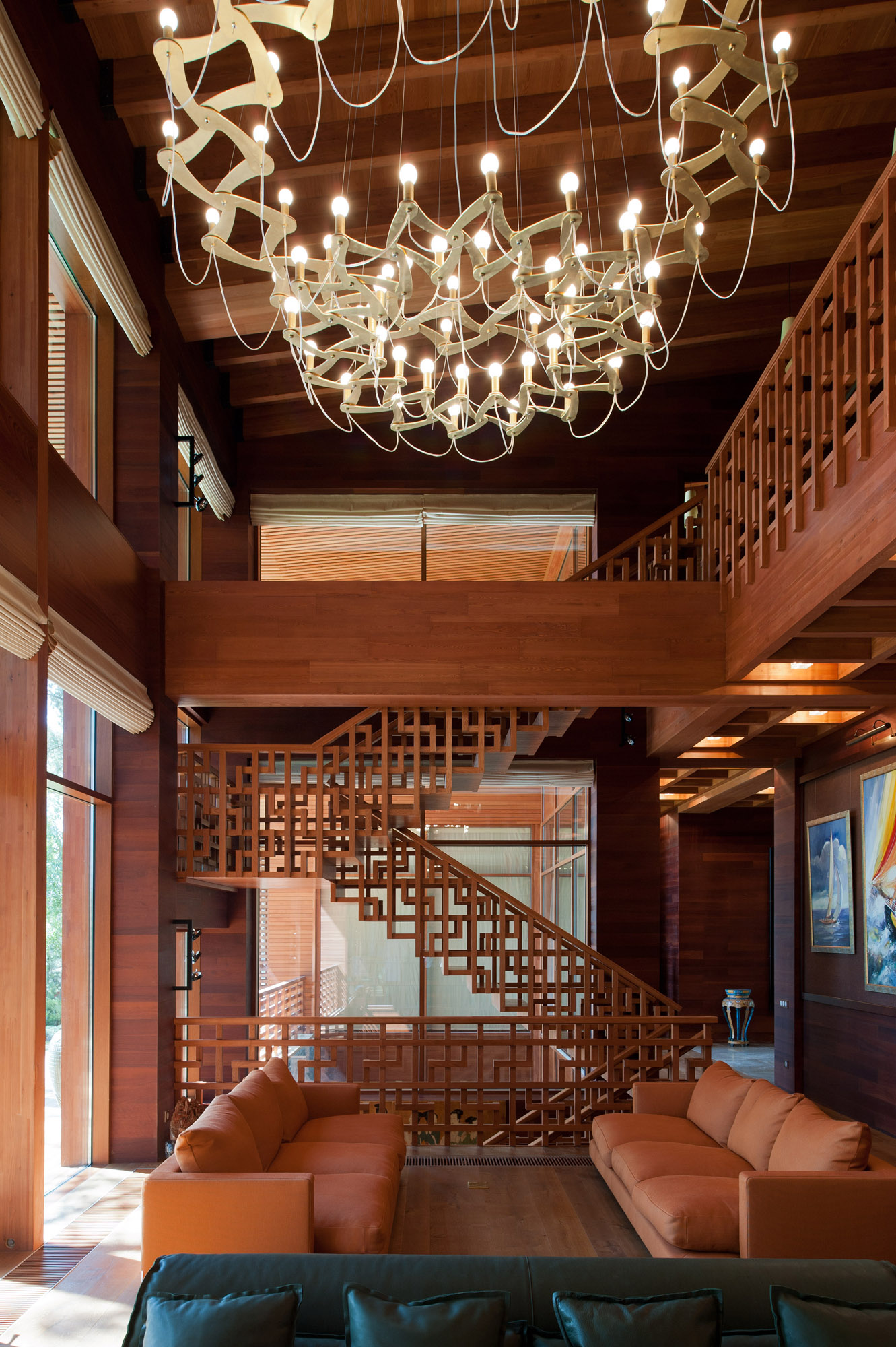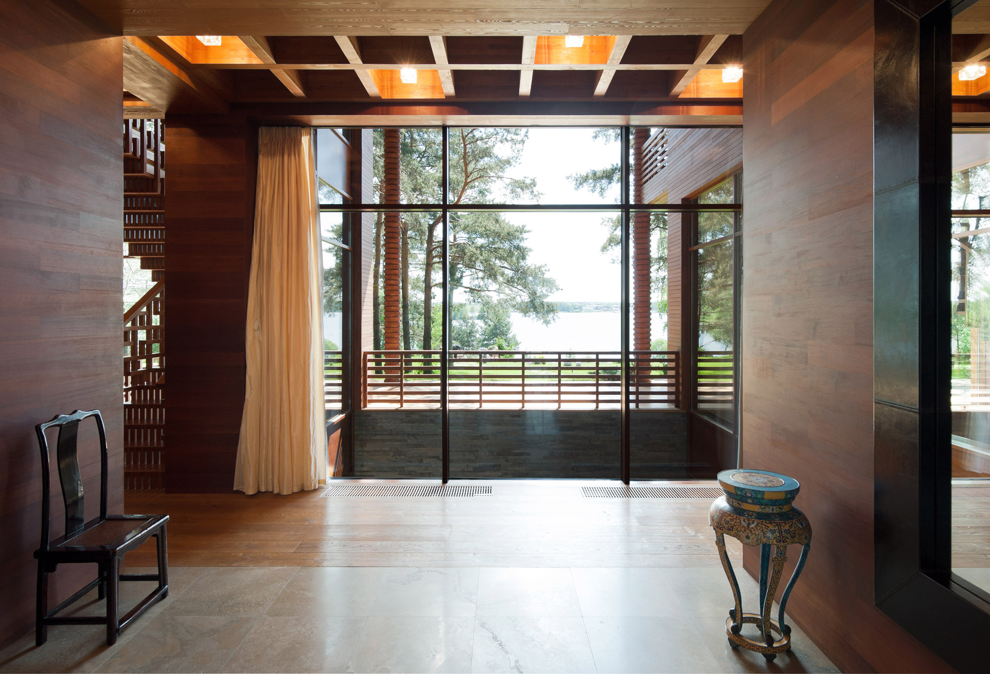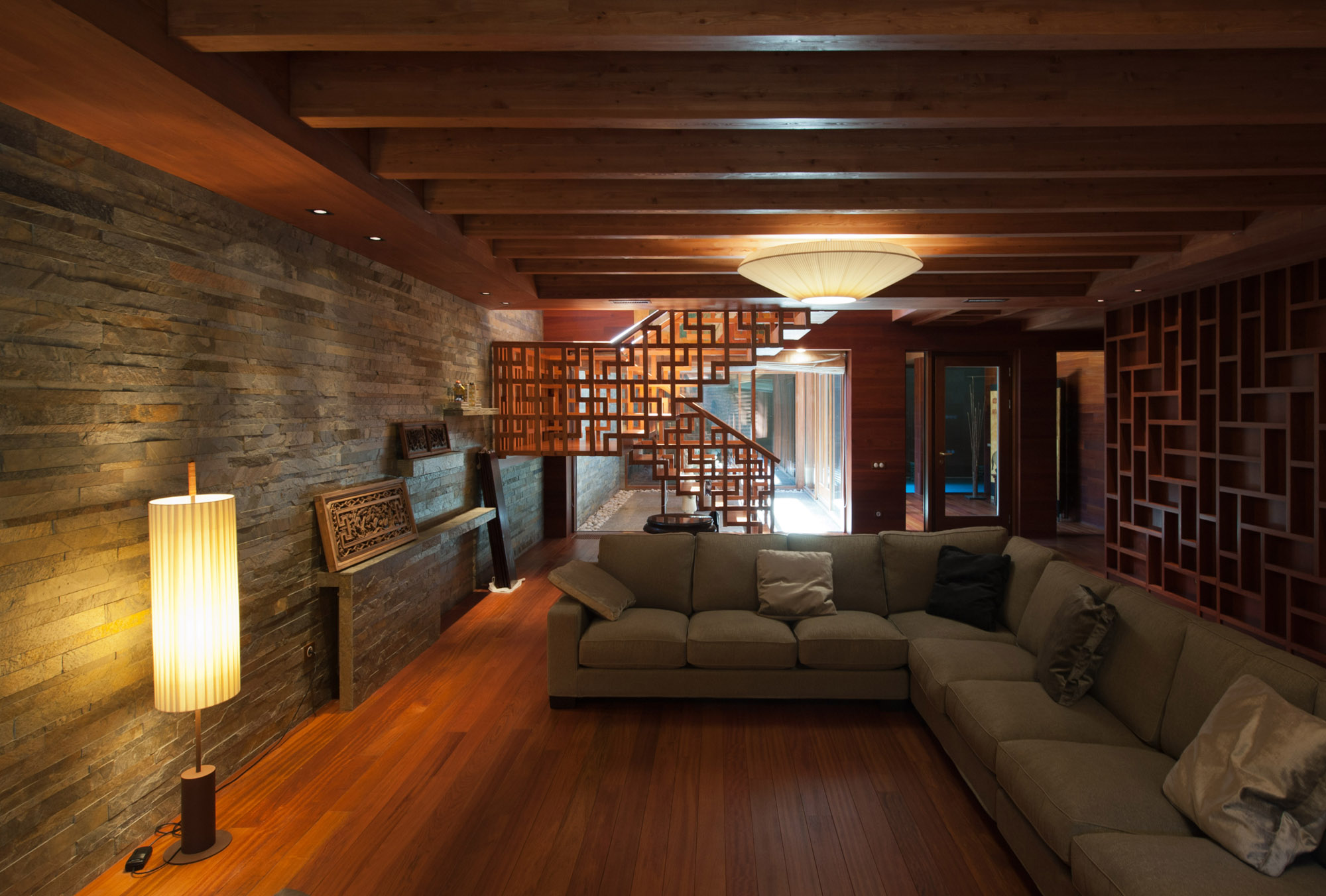 С нулевого на третий этаж ведет лестница, также выполненная по индивидуальному проекту в китайской стилистике.