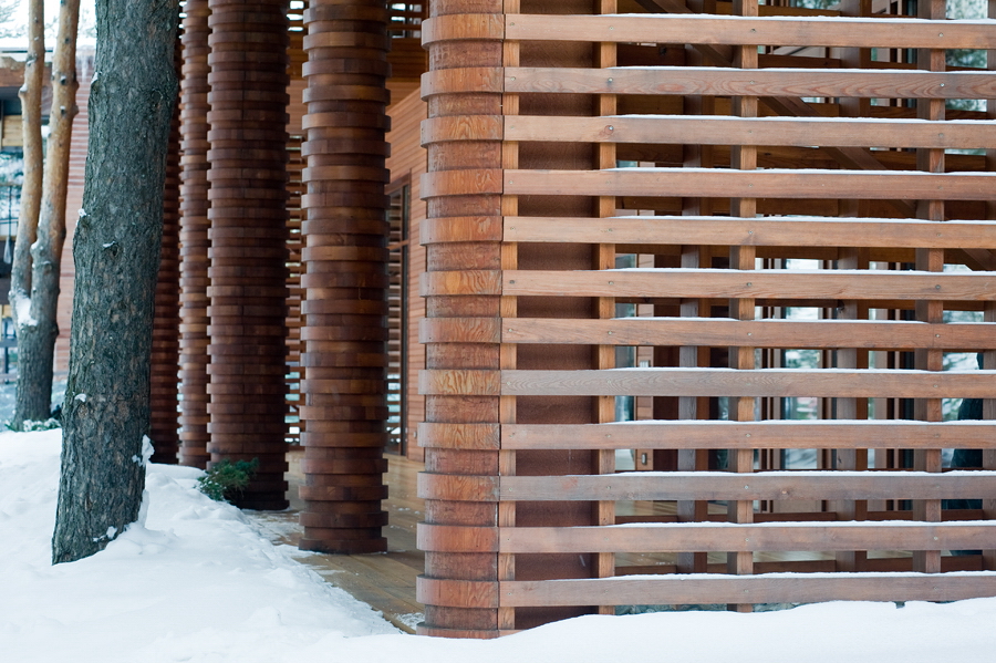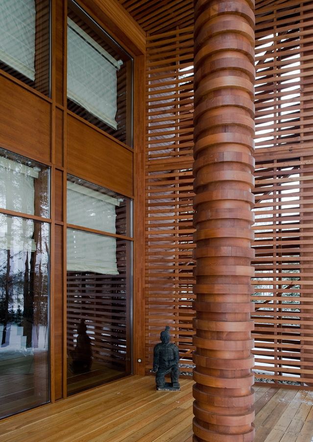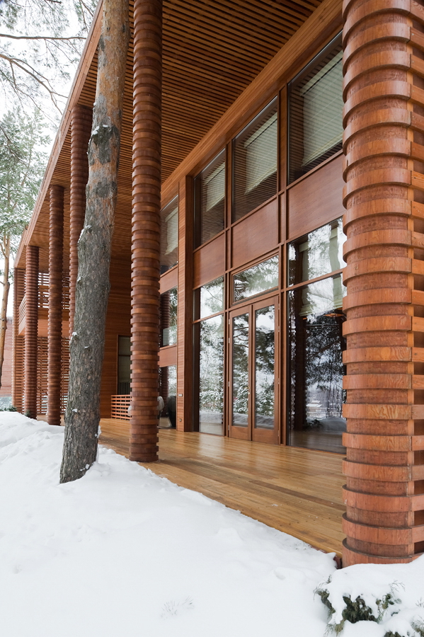 Колонны из лиственницы набраны из колец и собраны непосредственно на стройке.