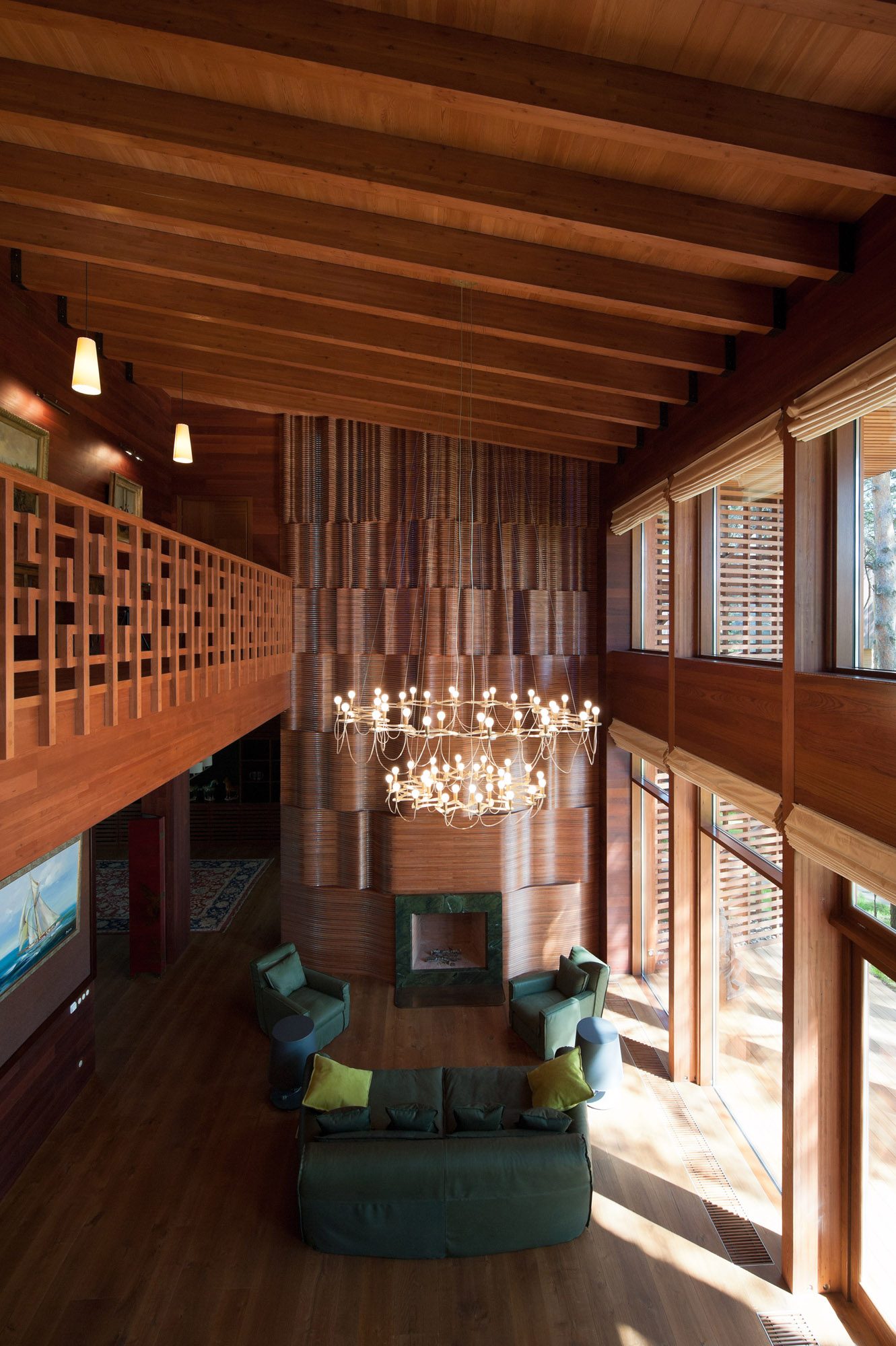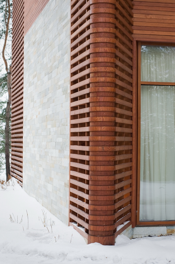 Фасады облицованы деревянной лиственничной доской и бруском, затонированными под красное дерево.